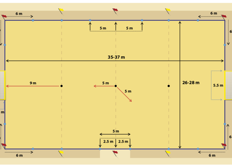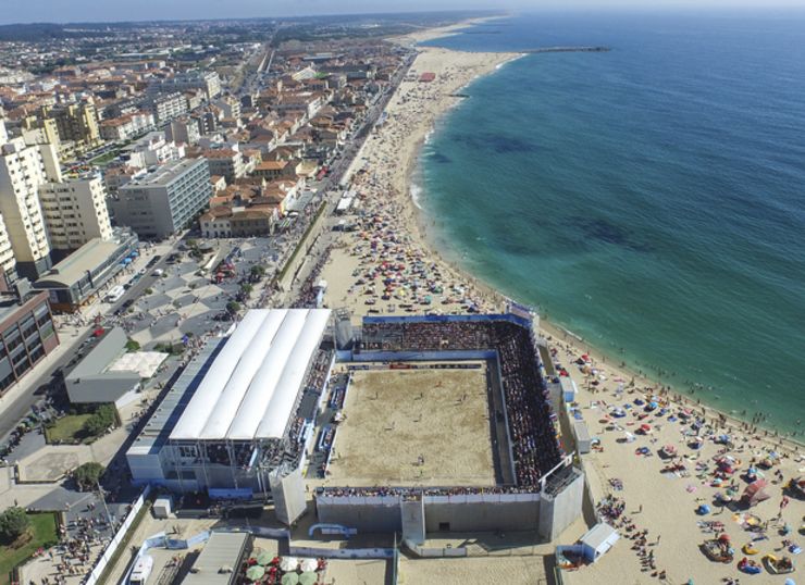 A beach soccer field measures 40m x 30m + structures for stands (3,000 public seats + 500 VIP seats).